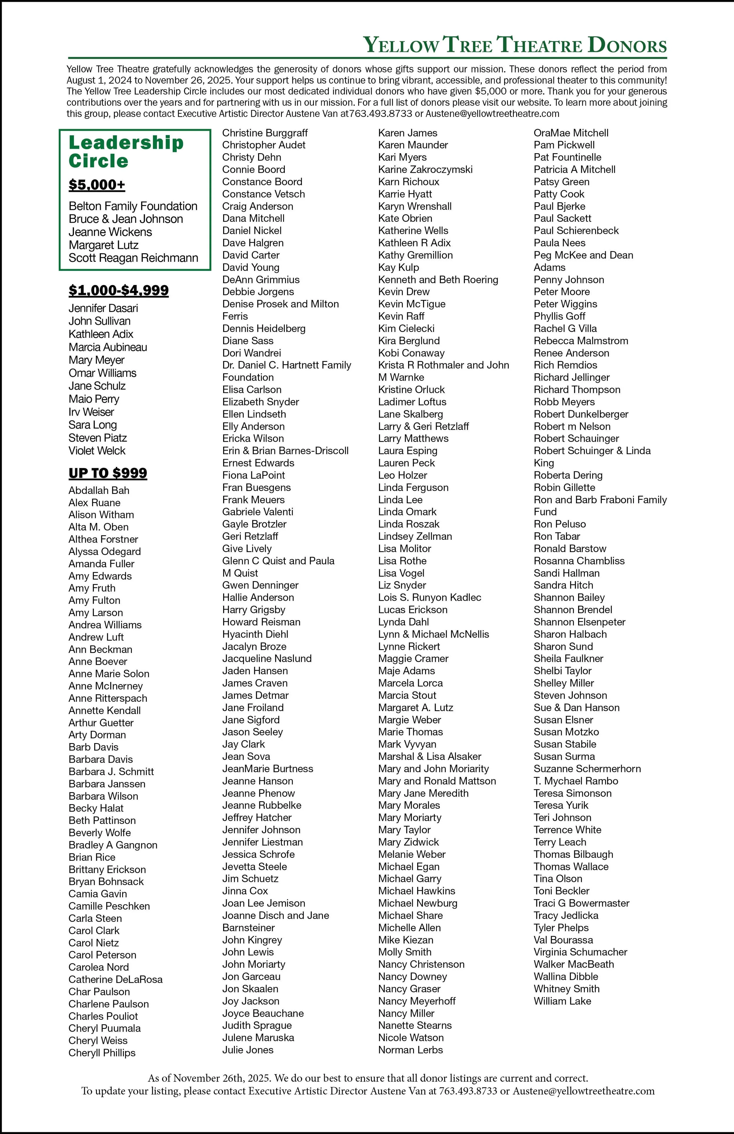 Yellow Tree Theatre is powered by people like you who believe in bold stories and vibrant community. Your gift helps us keep creating the kind of theatre that brings folks together, sparks joy and lifts up local artists. Every dollar truly makes a difference. If you’re able, please donate and help keep the magic shining bright. 💛